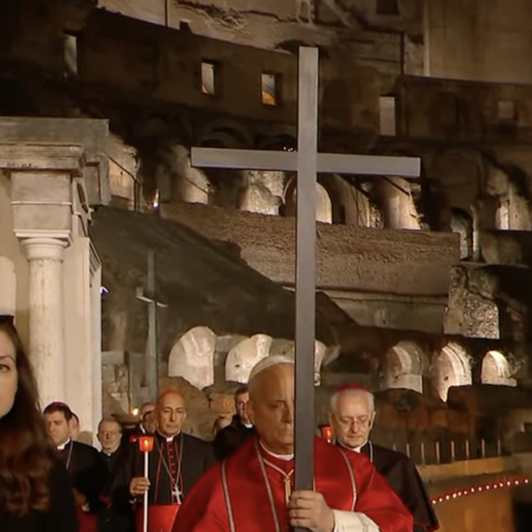 Il Papa, con la mozzetta rossa e la stola, nella sua prima Via Crucis al Colosseo, ha portato…