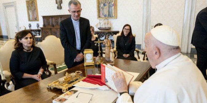 Ines Murzaku e padre Zef Bisha hanno potuto presentare il libro personalmente a Papa Francesco nel corso di una udienza privata lo scorso 10 luglio, una eccezione nel programma di vacanze del Papa “Sempre avanti”, ha commentato il Papa ricevendo il libro. (ACI Stampa).