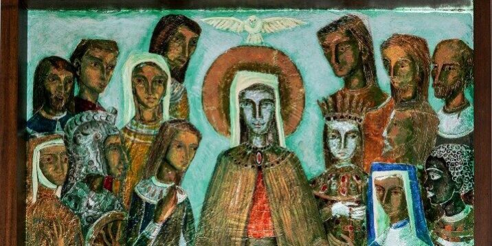 Maria è presente nel Cenacolo con gli Apostoli, accogliendo lo Spirito Santo. La sua presenza materna sostiene la nascita e la missione della Chiesa nel mondo.