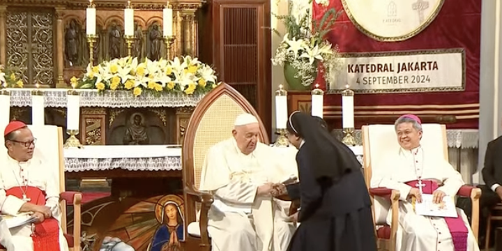“Amato Papa Francesco, a nome di tutti i consacrati e le consacrate in Indonesia, desidero esprimere profonda gratitudine per la Sua visita, che ispira e rafforza il nostro impegno verso Dio. Nonostante la vastità dell’Indonesia, noi consacrati e consacrate ci sentiamo uniti nel nostro lavoro, sostenuti dalla Chiesa e dalla Conferenza episcopale indonesiana”. E’ iniziata così la testimonianza di una religiosa, suor Rina Rosalina, delle Missionarie Clarisse del Santissimo Sacramento, durante l’incontro di Papa Francesco con i vescovi e il clero nella Cattedrale di Giacarta. “Il Signore ci ha invitato a camminare insieme nel nostro pellegrinaggio ed è nostra responsabilità rispondere al suo invito non solo nelle nostre comunità locali, congregazioni e diocesi, ma anche con Sua Santità, in comunione con la Chiesa universale”, ha continuato. La suora non ha fatto mancare al Pontefice anche una rimostranza: “Santo Padre, cerchiamo sempre di imparare da Lei. Purtroppo, a causa della distanza e delle barriere linguistiche, a volte abbiamo difficoltà a studiare i documenti emanati da Roma”.