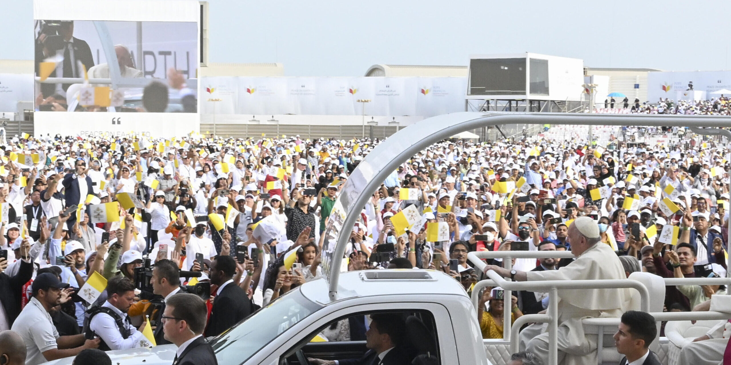 Carissimi, io oggi vorrei ringraziarvi per la vostra testimonianza mite e gioiosa di fraternità, per essere in questa terra semi dell’amore e della pace. È la sfida che il Vangelo consegna ogni giorno alle nostre comunità cristiane, a ciascuno di noi. E a voi, a tutti voi che siete venuti a questa Celebrazione dai quattro Paesi del Vicariato Apostolico dell’Arabia del Nord – Bahrein, Kuwait, Qatar e Arabia Saudita –, nonché da altri Paesi del Golfo, come pure da altri territori, oggi porto l’affetto e la vicinanza della Chiesa universale, che vi guarda e vi abbraccia, vi vuole bene e vi incoraggia. La Vergine Santa, Nostra Signora di Arabia, vi accompagni nel cammino e vi custodisca sempre nell’amore verso tutti.