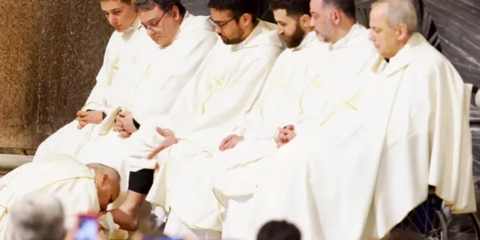 Parlando della lavanda dei piedi Leone XIV ha osservato: “Il gesto del Signore fa tutt’uno con la mensa alla quale ci ha invitato. È un esempio del sacramento: mentre ne conferma il senso, ci consegna un compito che vogliamo assumere come nutrimento per la nostra vita. Quel che il Signore ci fa vedere, prendendo l’acqua, il catino e il grembiule, è molto di più che un modello morale. Egli ci consegna infatti la sua stessa forma di vita: lavare i piedi è gesto che fa sintesi della rivelazione di Dio, segno esemplare del Verbo fatto carne, sua memoria inconfondibile. Facendo propria la condizione del servo, il Figlio rivela la gloria del Padre scardinando i criteri mondani che sporcano la nostra coscienza”.