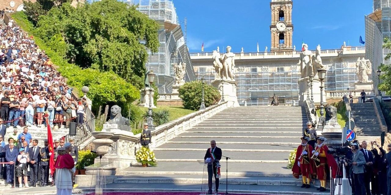 Papa Leone XIV – nel tragitto verso la Basilica di San Giovanni in Laterano per l’insediamento sulla Cattedra di Vescovo di Roma – ha sostato in Piazza dell’Aracoeli ai piedi del Campidoglio per ricevere l’omaggio del Sindaco e della Città di Roma.